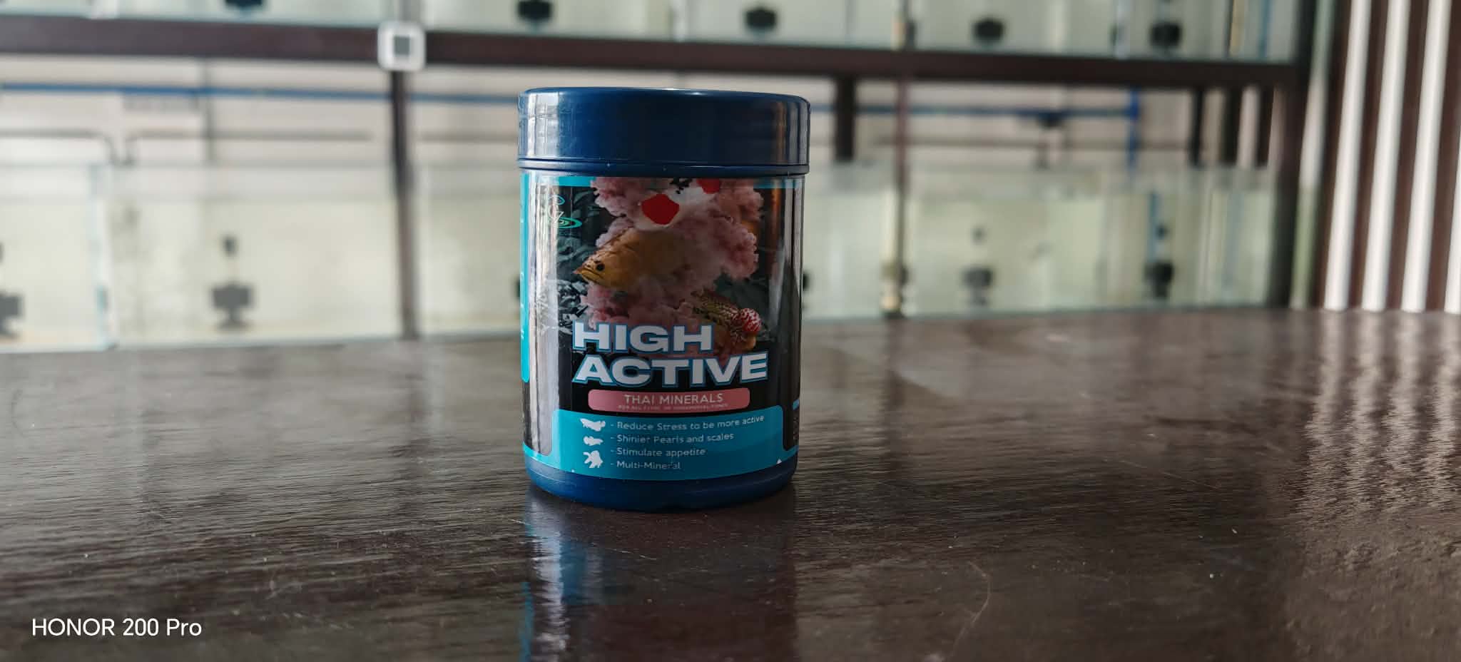 “HIGH ACTIVE” is a multi mineral essence for ornamental fish. It replenishes calcium, magnesium, pottasium, etc. From regular tap water in host households.